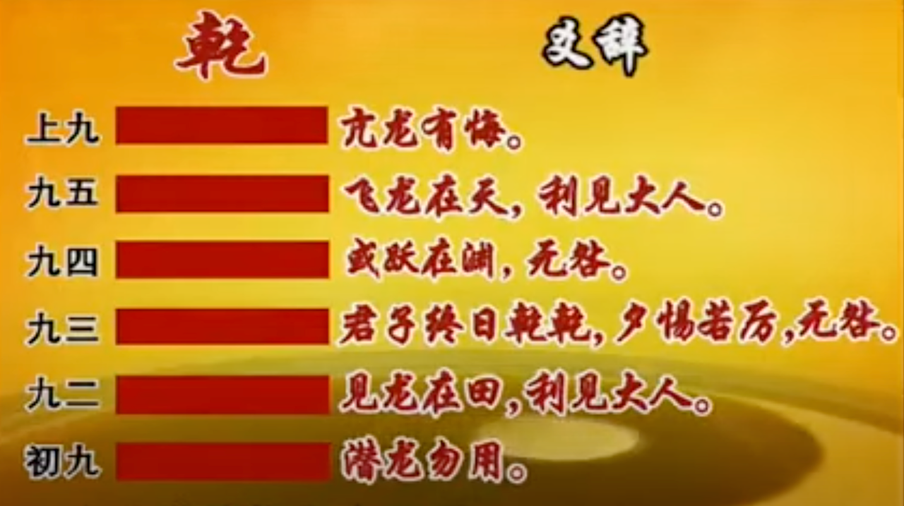 건괘의 여섯 양효는 자강불식의 정신을 실천하는 군자가 겪는 인생의 여섯 단계를 여섯 마리의 용에 비유하여 설명합니다.