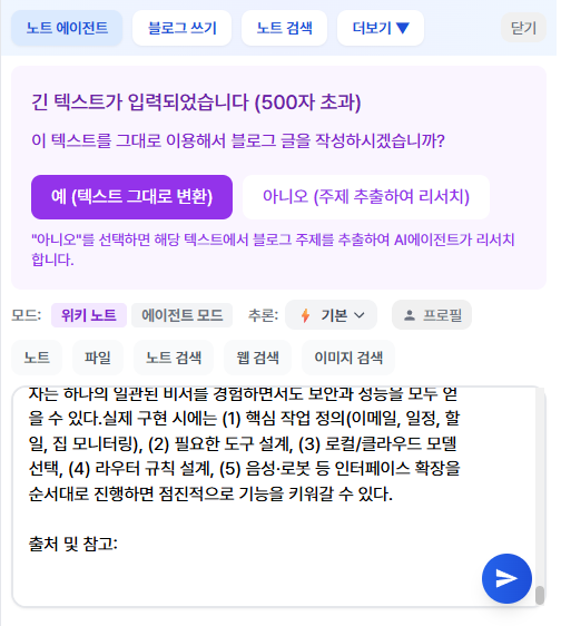 500자 이상의 텍스트를 붙여넣으면 자동으로 변환 여부를 물어봅니다. 이 때 텍스트를 그대로 변환하거나 주제를 추출하여 노트를 작성할 수 있습니다.