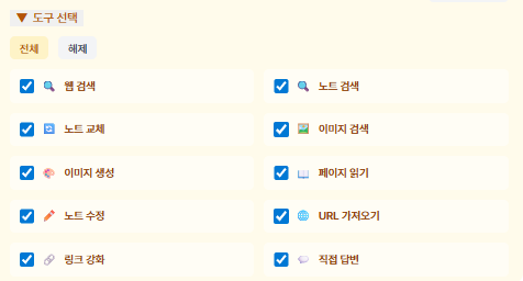 예를 들어 웹 검색은 리서치 후 이를 반영하여 노트 작성에 참고합니다. 노트 검색은 이전 노트에서 관련된 내용을 RAG 검색이나 직접 검색을 활용하여 찾아서 반영합니다. 이미지 검색은 관련 이미지를 찾아 노트에 반영하는 기능이구요.