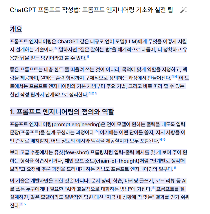 예를 들어 "웹 검색하여 챗GPT 프롬프트 작성법 노트 만들어줘" 라고 말해 보겠습니다.