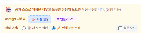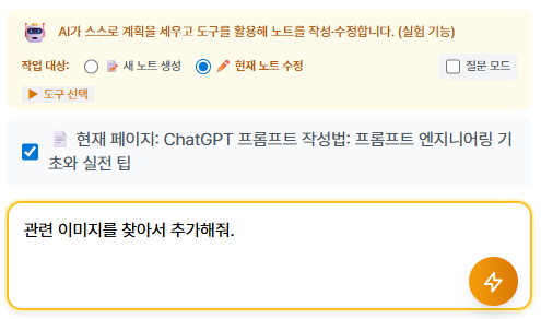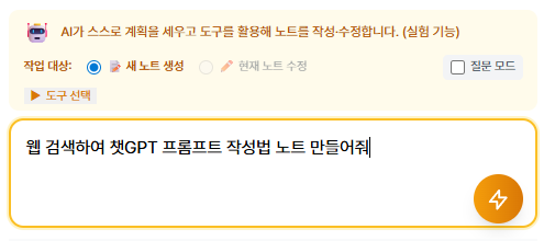 에이전트 모드는 AI 가 계획을 세우고 도구를 사용해서 노트를 작성하거나 수정하는 기능입니다.