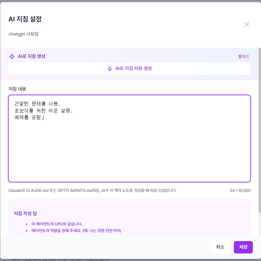 특히 지침을 설정하면 AI가 책 내의 노트들을 작성할 때 참고하는 프롬프트를 설정할 수 있습니다. 책의 일관성, 스타일, 필요 지식 등을 넣어 편리하게 작성할 수 있습니다.