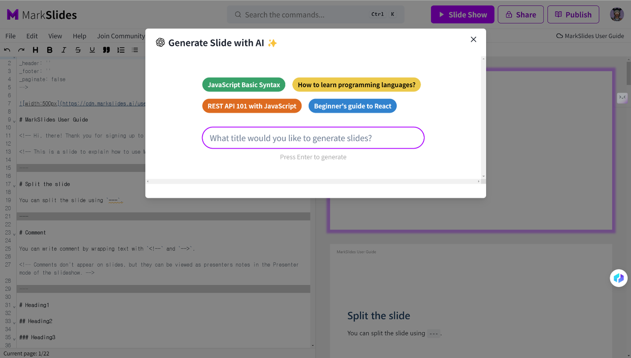 마크다운(Markdown) 문법을 활용하여 슬라이드를 생성하고 편집할 수 있는 웹 기반 프레젠테이션 제작 도구입니다. 복잡한 디자인 작업 없이도 간단한 텍스트 입력으로 전문적인 슬라이드를 제작할 수 있습니다.