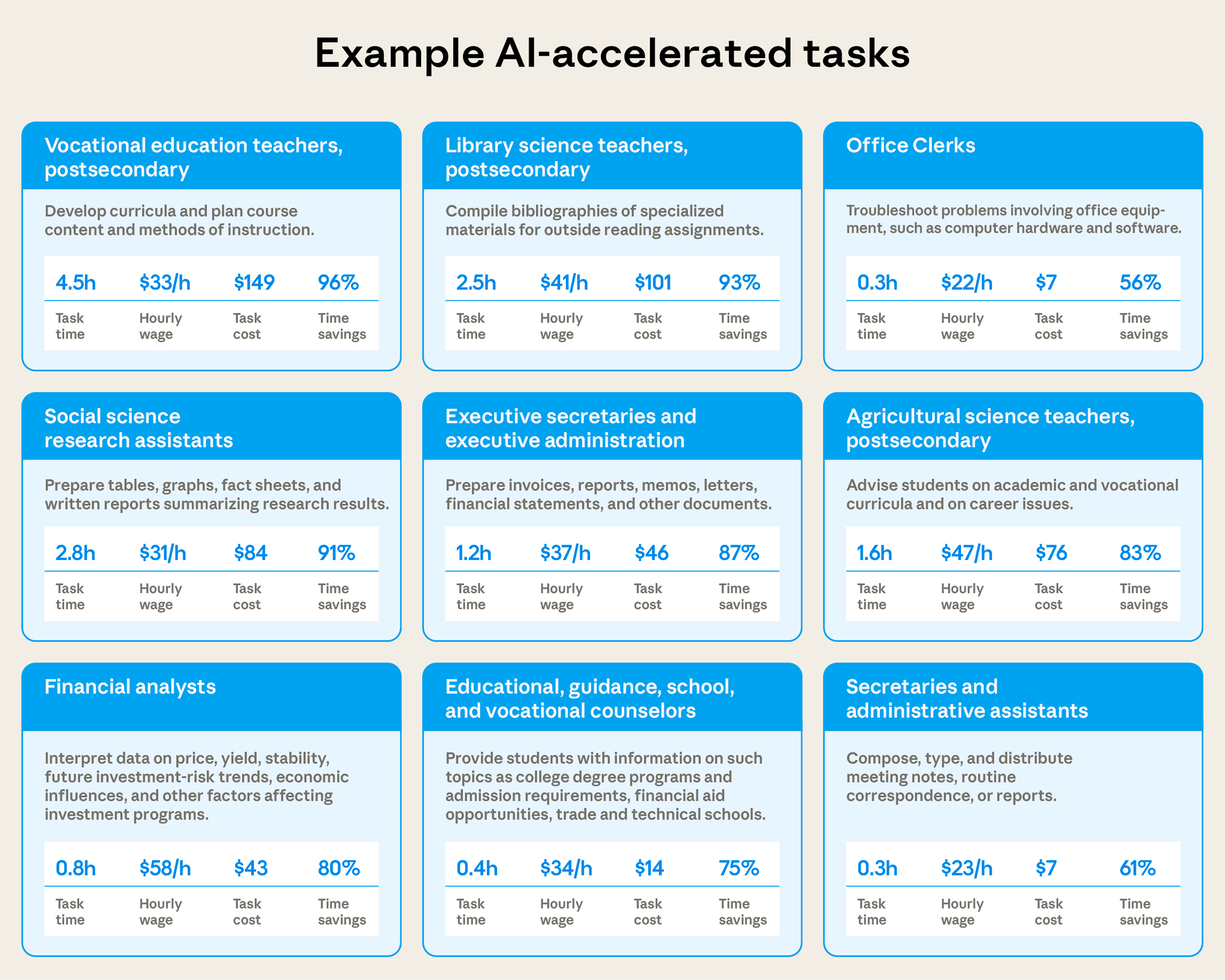 예를 들어, AI가 도와주는 커리큘럼 개발은 4.5시간짜리 작업도 11분 만에 끝나며, 문서 작성에서 87% 시간을 절약합니다. 의료 보조는 90%까지 시간 단축 가능—하지만 음식 준비나 단순 현장 업무는 줄일 수 있는 시간이 30분 정도에 불과했습니다. 즉, AI가 가장 빛을 발하는 분야와 그렇지 않은 곳의 격차가 큽니다.